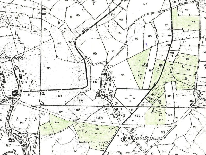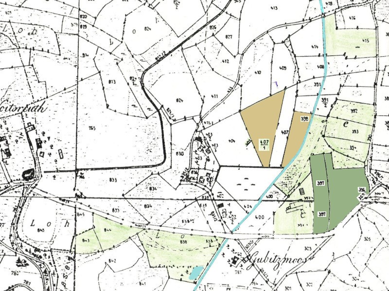 Nachfolgend sehen Sie die Flurkarte von einem Teil von Gubitzmoos und Voitsreuth. Die zu unserem Hofe gehörenden Grundstücke sind mit grüner Farbe unterlegt.